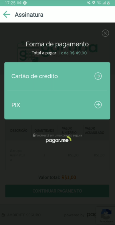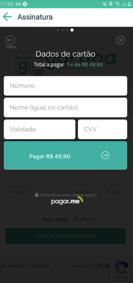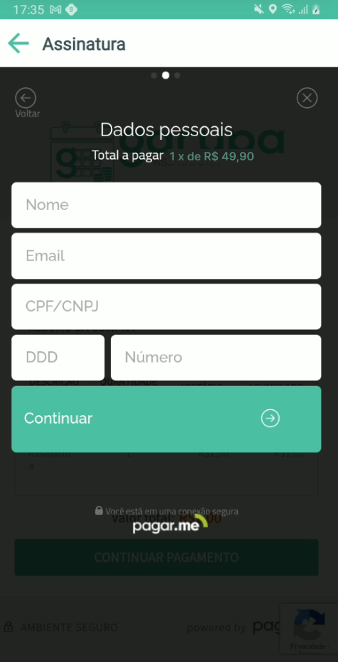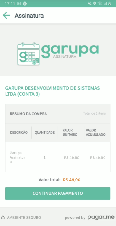 Após tocar em “Quero ser assinante!” será exibido uma tela que mostrará o valor da assinatura e ao “Continuar Pagamento” exibiremos uma tela para dar continuidade a contração.