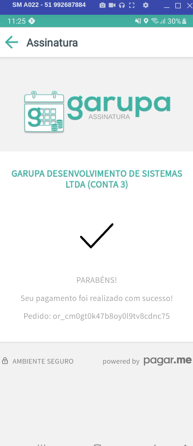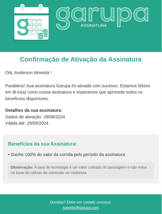 Você também receberá um email informando a ativação de sua Assinatura Garupa após o recebimento de seu pagamento.