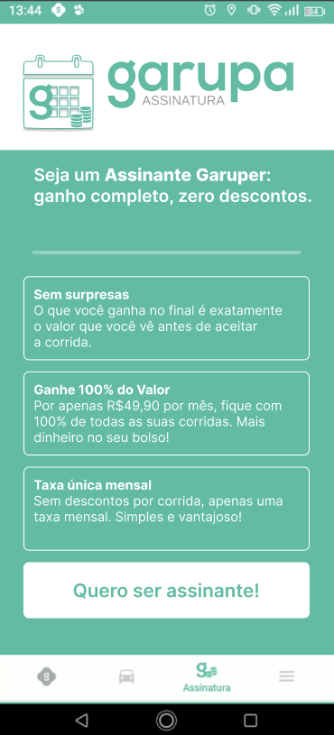 Pronto, a partir do recebimento do pagamento da Assinatura Garupa toda corrida realizada após sua finalização somente será descontado a taxa de tecnologia e o restante será somado ao saldo do motorista durante o período (30 dias) da validação da Assinatura.